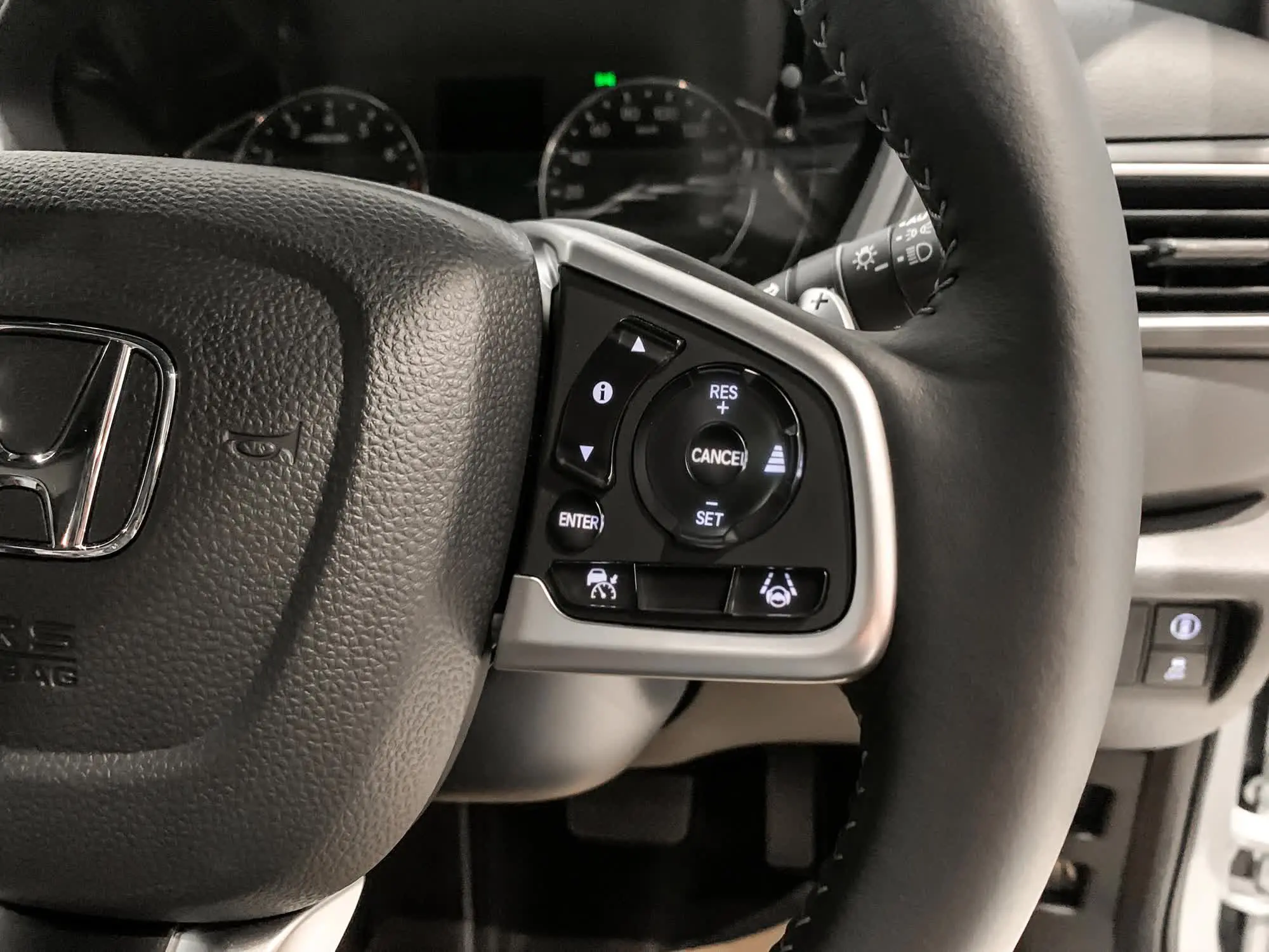 Vô lăng ba chấu, bọc da tích hợp các phím chức năng như đàm thoại rảnh tay, media,… Quan trọng nhất là loạt nút bấm ga tự động thích ứng, hỗ trợ giữ làn đường nằm trong gói an toàn Honda Sensing.